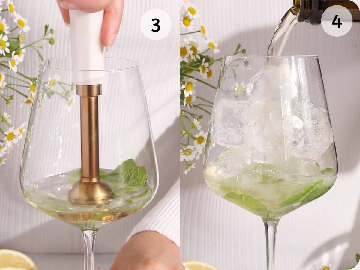 - Place the mint in your glass along with the elderflower cordial or liqueur, then muddle until the mint is just bruised. Do this VERY gently and carefully so as not to break the stem of the wine glass! 5-6 gentle presses is fine. Tip: if you don't have a muddler, use the handle of a wooden spoon.
