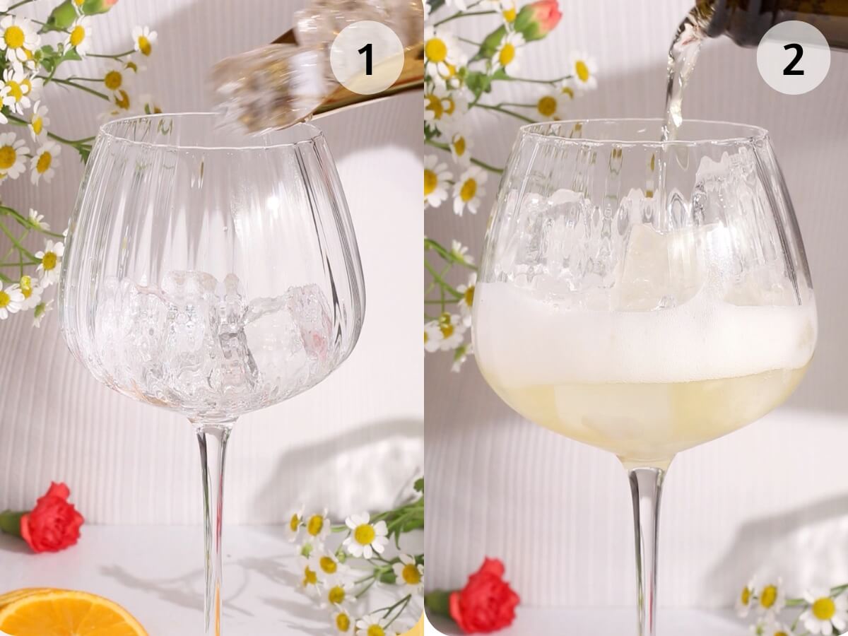 - Fill your glass with ice. Add sparkling wine, Aperol replacement and soda water. Stir gently and add your orange slice and/or edible flowers. Serve immediately.